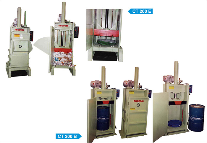 • Modelos CTS y CTA 200-E: Para la compactación de Tambores metálicos y enfardado de materiales varios (papel, cartón, plásticos, etc.), con bandeja colectora de líquidos con cupla de vaciado